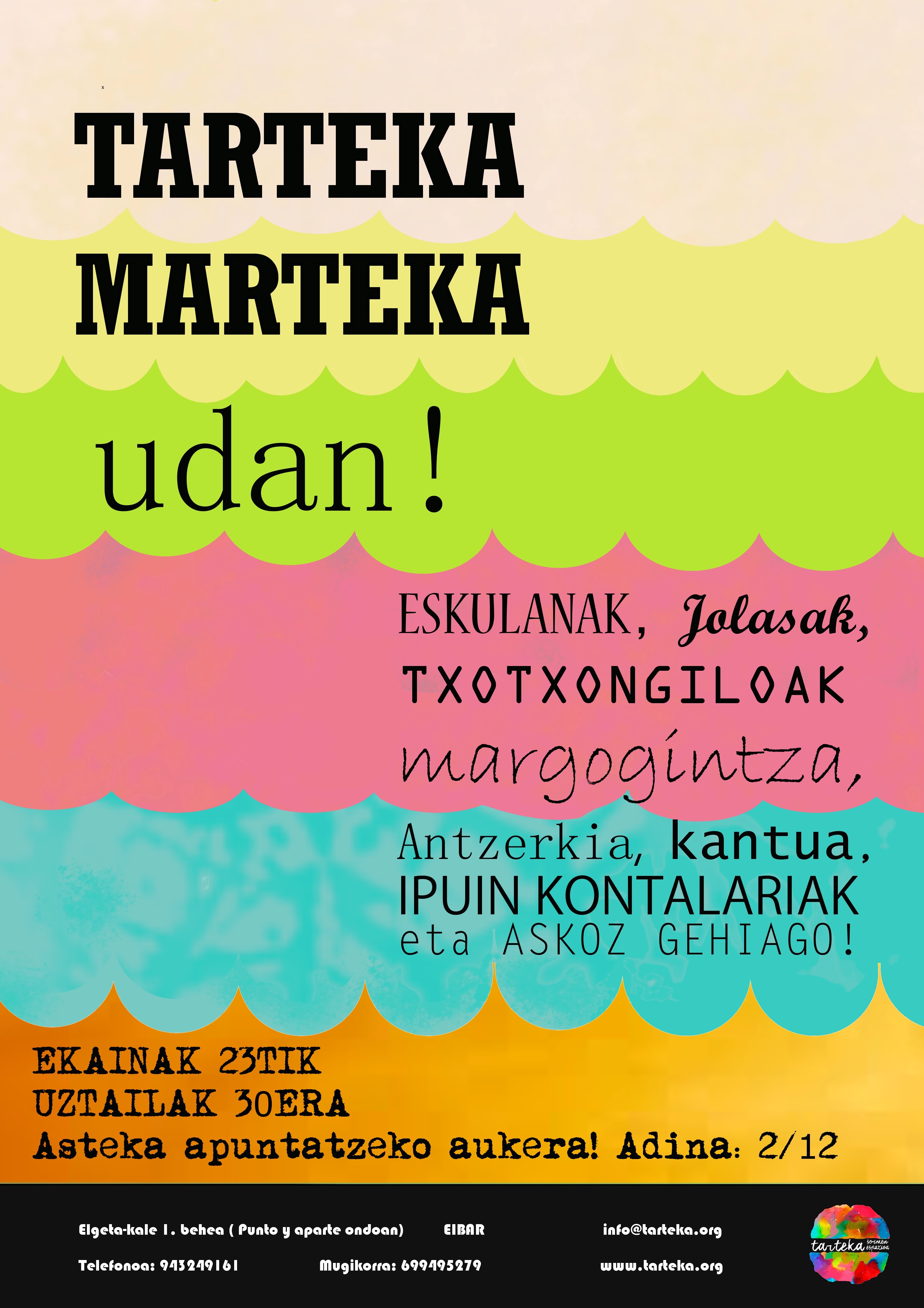 Tarteka Sormen Espazioak ere tailerrak antolatuko ditu. Ekaineren 23tik uztailaren 30era bitartean antolatuko ditu, eta asteka banatuta egongo dira. Hau da, umeek aukera izango dute aste bete joateko, bi aste, lau… edo hilabete osoa.