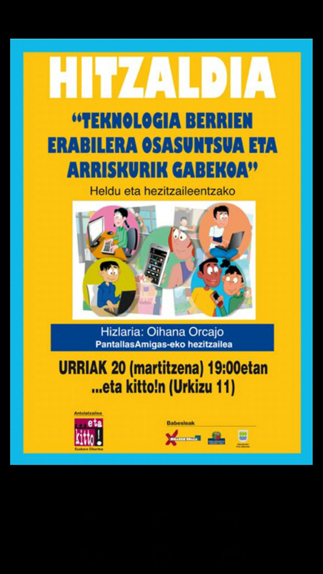“Teknologia berrien erabilera osasuntsua eta arriskurik gabekoa” goiburua duen hitzaldia eskainiko du PantallasAmigas-eko Oihana Orcajo hezitzaileak datorren martitzenean (urriak 20). Hitzordua 19:00etan izango da …eta kitto! Euskara Elkarteak Urkizun dituen lokaletan. Hitzaldia heldu eta hezitzaileei zuzenduta dago.